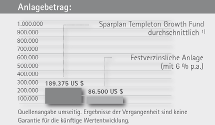 Angenommen Sie hätten 15 Jahre lang jeden Monat 300 US$ in einen Sparplan investiert, dann beträgt die Differenz zwischen einem garantierten Festzins-Sparplan bei der Bank und einer Anlage in den von uns seit Jahren empfohlenen Templeton Growth Fund exakt 102.875 US$. Jeweils mit dem Durchschnittswert und über alle 15-Jahresperioden seit Gründung des Templeton Growth Fund im Jahr 1954 gerechnet.