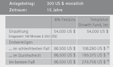 Angenommen Sie hätten 15 Jahre lang jeden Monat 300 US$ in einen Sparplan investiert, dann beträgt die Differenz zwischen einem garantierten Festzins-Sparplan bei der Bank und einer Anlage in den von uns seit Jahren empfohlenen Templeton Growth Fund exakt 102.875 US$. Jeweils mit dem Durchschnittswert und über alle 15-Jahresperioden seit Gründung des Templeton Growth Fund im Jahr 1954 gerechnet.
