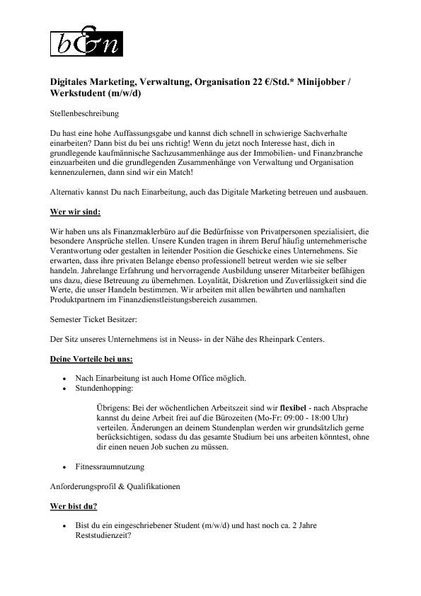 Digitales Marketing, Verwaltung, Organisation 22 €/Std.* Minijobber / Werkstudent (m/w/d)